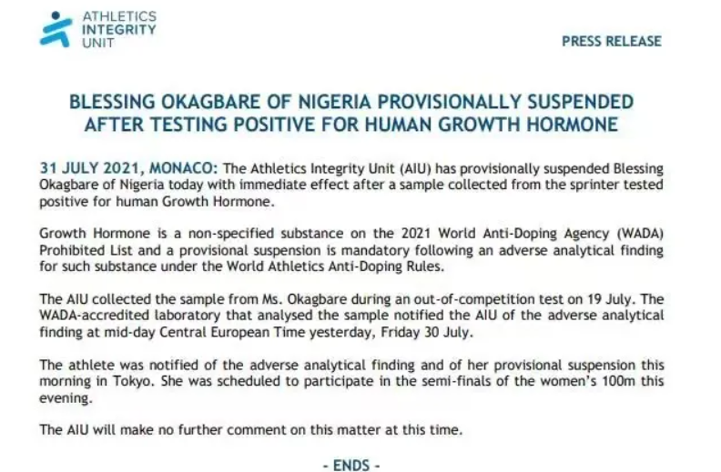 独立于世界田联的田径诚信委员会(AIU)当地时间7月31日宣布,在对尼日利亚女子短跑运动员布莱辛·奥哈巴雷(Blessing Okagbare)进行的兴奋剂测试中,检测出人类生长激素成分,判定该运动员丧失比赛资格。这是本届东京奥运会发现的首例未通过兴奋剂测试的情况。