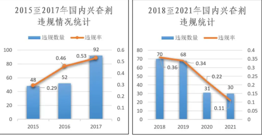 2015年至2017年,国际反兴奋剂形势复杂多变,国内兴奋剂阳性率不断攀升,从2015年48例增至2017年92例,短短3年,数量增加近1倍;兴奋剂违规率居高不下,从2015年0.29%至2017年0.53%;运动员故意使用兴奋剂的问题突出,误服误用的风险较高,兴奋剂问题频发。