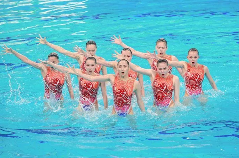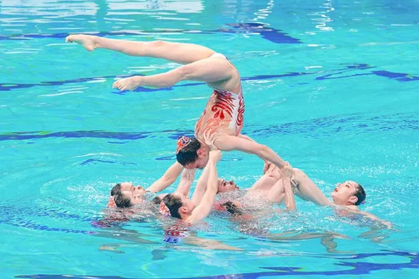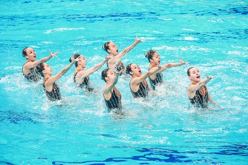 北京代表队带来的表演主题是《疯狂机器人》与《光影之刃》,姑娘们延续了前一天的良好表现。水中的8人仿佛化作一副“身躯”,动作整齐划一,表演行云流水,斑驳的光影纵横交错,真实与虚幻相结合,灵动的身影探索其中,是果敢与刚强的化身。电光火石之间剑刃翻飞,疾如风、快如电,金属的撞击声中身影掠过,体轻如燕、带着力量斩破荆棘,峰回路转之时,炙热的影刃仍在寥寥生辉。精彩的表演引得现场观众连连称赞,并报以热烈的掌声。