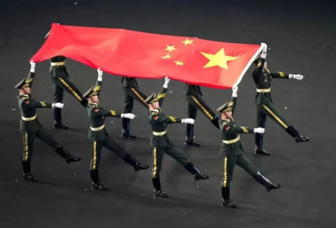 一名儿童小号手吹响《我和我的祖国》的悠扬旋律。中国各行各业、先进模范人物、56个民族的代表,用双手将鲜艳的五星红旗缓缓传递到体育场升旗区,交付礼兵手中。全体起立,高唱中华人民共和国国歌。五星红旗冉冉升起,迎风飘扬。