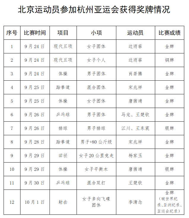 新京报讯 杭州亚运会于10月8日晚闭幕。北京市共有41名运动员参加了22个项目43个小项的比赛,获得17枚金牌、4枚银牌、4枚铜牌,共计25枚奖牌,金牌数超过上届亚运会,圆满完成了参赛任务,为中国体育代表团连续第11次位居亚运会金牌榜首作出了贡献。