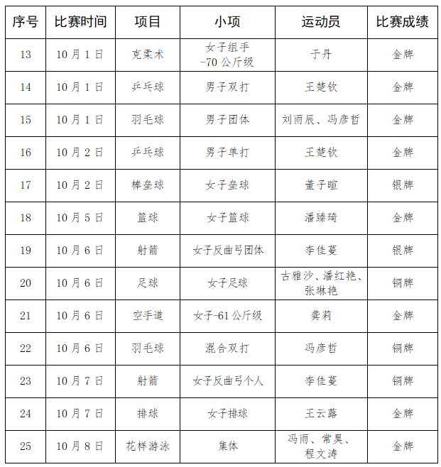 乒乓球运动员王楚钦表现突出,在10月2日进行的男单决赛中4比3战胜樊振东获得冠军,成为第一位在同一届亚运会上获得男单、男双、混双、男团四枚金牌的乒乓球运动员。