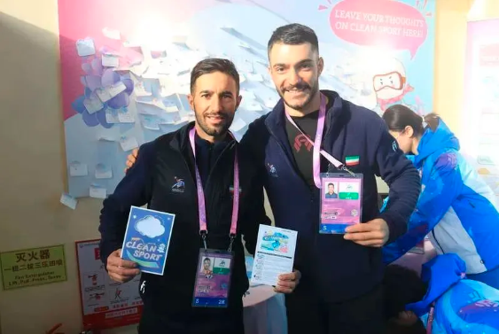 哈尔滨亚冬会,伊朗运动员在反兴奋剂拓展教育站展示宣传品