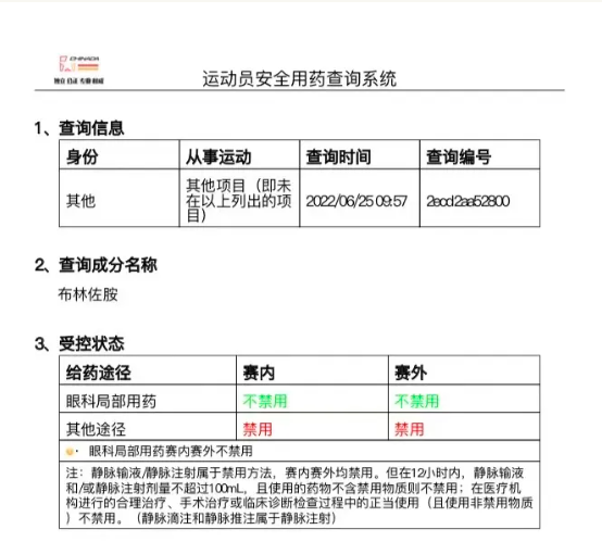 2、运动员眼科局部使用布林佐胺的,应当保留好完整的医疗材料(包括挂号单、处方单、病历、支付凭证、实物图片等)备查。