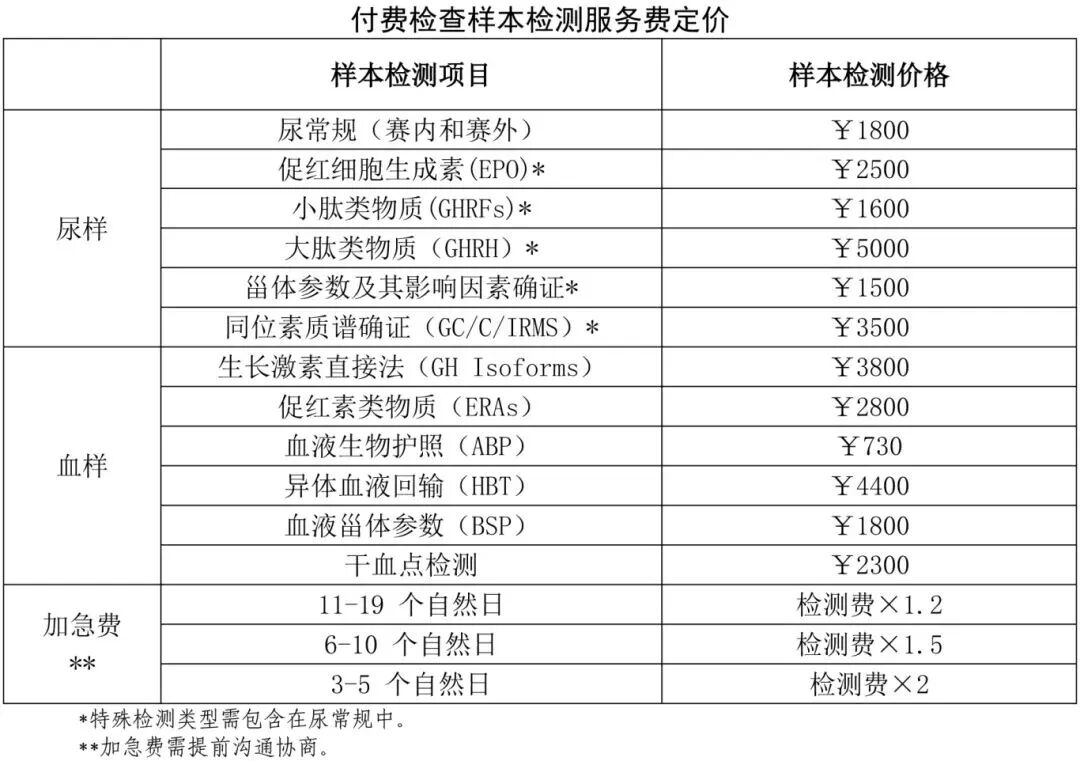 付费检查样本在境内外WADA认可的兴奋剂检测实验室开展检测的收费标准均统一如下。特殊情况下,加急检测需额外支付加急费。