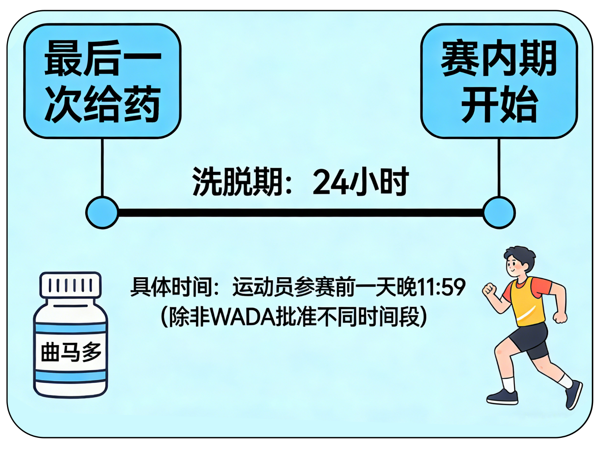 tips~“洗脱期”是指从最后一次给药到赛内期开始的时间(即从运动员参赛的前一天晚11:59开始,除非WADA为某一特定运动项目批准了不同的时间段),从而为曲马多在体内清除到低于报告水平留出足够时间。
